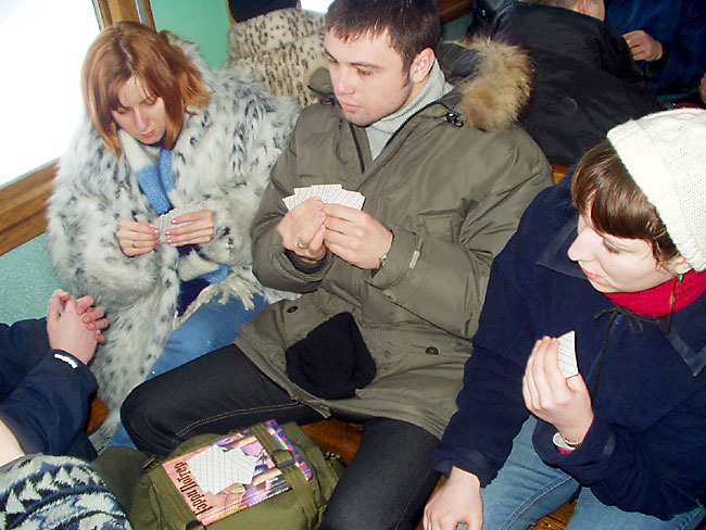 Назад мы возвращались укороченным составом, я забыл паспорт на базе, а в плацкартном вагоне нашими соседями оказались мама с 4-х летним ребёночком. Сначала мы обрадовались, а потом оказалось, что ребёнок плохо слышит, говорит, думает, настроен агрессивно и абсолютно не управляем. Мы гуманные люди - поняв, что ещё немного и мы кому-то устроим геноцид, мы предпочли пойти в гости к знакомым Катищи. Пройдя 17 вагонов мы выяснили что первые два занимает толпа пьяных КПИшников 3-5 курсов. Мы органично влились в их вакханалию (возможно я всё-таки опубликую галерею фоток ОТТУДА.. запароленную %) В 23 мы вернулись назад спать. Ночью никто не пострадал.