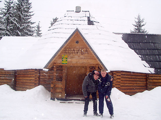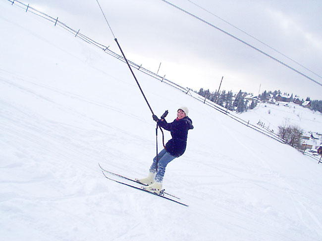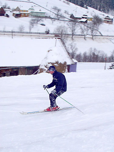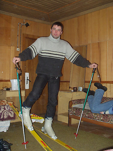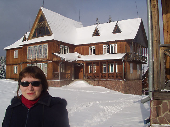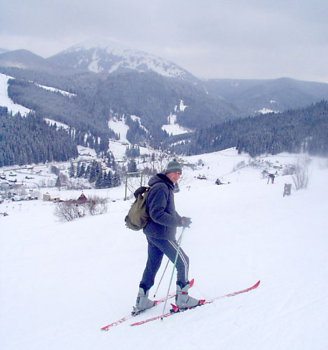Сначала всё шло на удивление хорошо (не считая того, что в поезде ребята недобро грызлись между собой). Из Ивано-Франковска мы на маршрутке за 6грн приехали в Коломыю к знакомым Катищи и поселились в роскошные номера спорткомплекса "Локомотив" абсолютно на шару. Поиграли в настольный теннис, сходили в сауну. Знакомые перезвонили на несколько баз и мы выбрали Горный - оптимальный вариант по цене и расположению. С утра мы сели в дизель до Яремчи. Протрусившись 3 часа в неотапливаемом вагоне мы десантировались уже в горах. Маршрутки в Яблуныцю (именно там располагалась наша база) довольно долго не было, поэтому приходилось обогреваться подручными средствами. Короче, на базу мы приехали, расселились по двухместным номерам, откуда выбирались в генделыки и покататься на лыжах. Никаких общих пьянок (на что я в тайне рассчитывал) не было, Саня и Лена на второй день конкретно заболели и вообще никуда не вылазили, с ДиММом и Лизой мы встречались в основном на спусках. Огорчённый таким некультурным времяпровождением на третий день я в компании Лизы и Катищи выглушил пол бутылки коньяка "Карпаты" (43% объёмных) чем СИЛЬНО расстроил свою печень - до конца отдыха я питался мюслями, кашками и белым хлебом без корочки. Зато погода и вообще катание на лыжах было просто КЛАССНЫМ. Время от времени подсыпало нового снежку, ветра практически не было, температура не опускалась ниже -10. Так что покатались мы классно. Полностью освоили 900 метровый спуск, а я даже пару раз упал и поломал крепление на ботинке на 1200 метровом. Я на ближайший месяц наигрался в МтГ и вообще отдохнул морально и физически. Ну и с личной жизнью на базе отдыха тоже неплохо - да, ДиММ? ;) В одном баре в последний день мы даже нашли настольный теннис :)